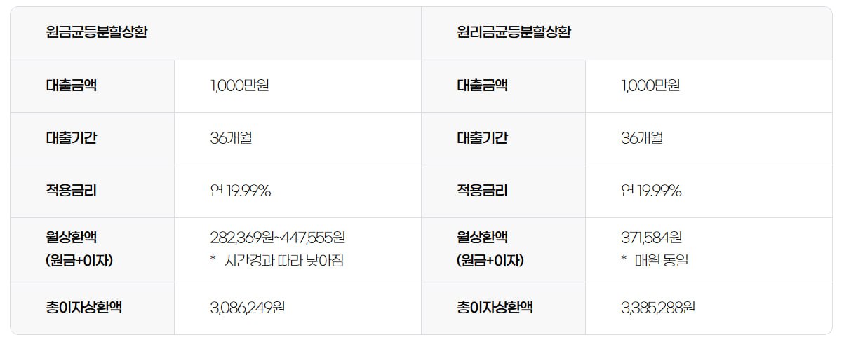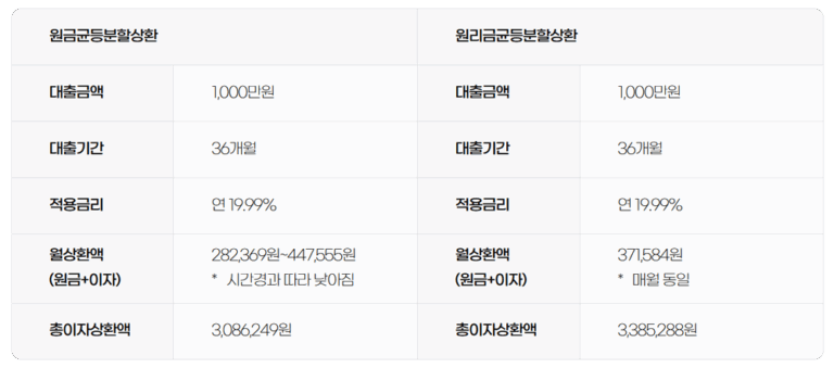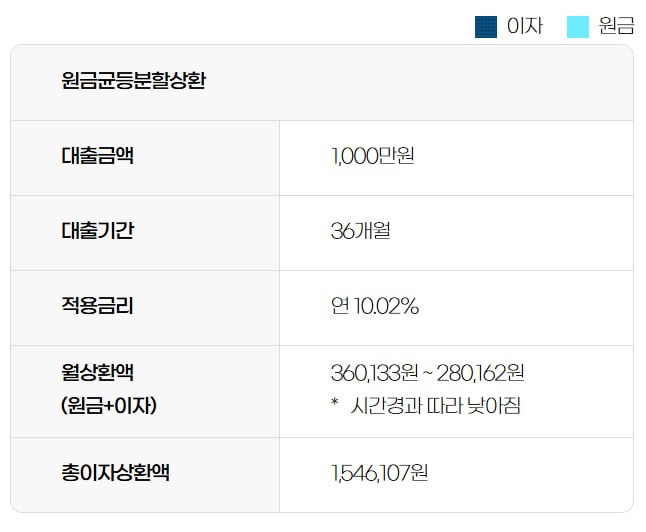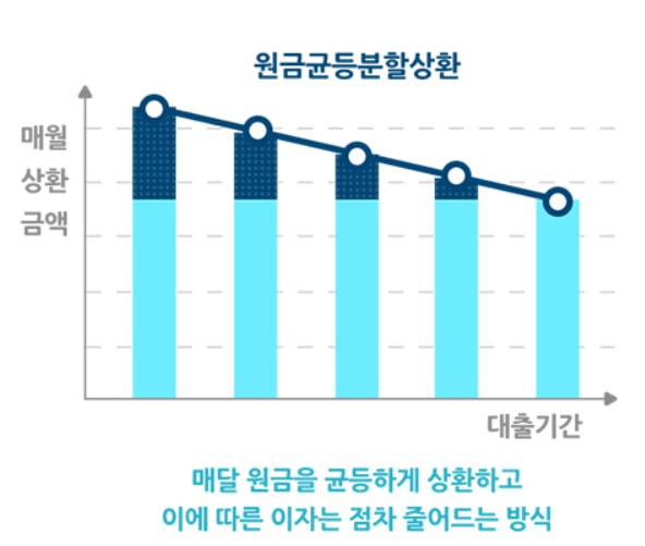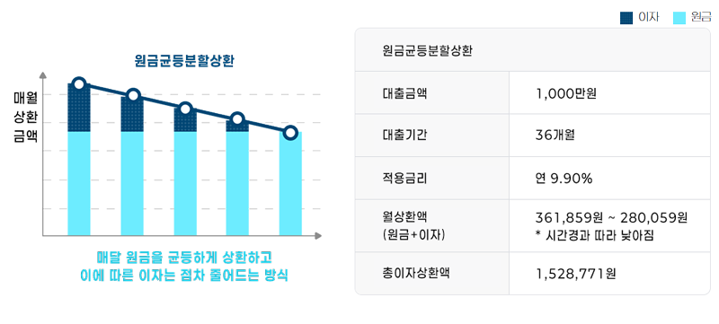 * 매월 원금균등분할상환 : 대출원금은 대출기간 내 동일하게 납입하고 이자는 기간경과에 따라 감소하는 방식