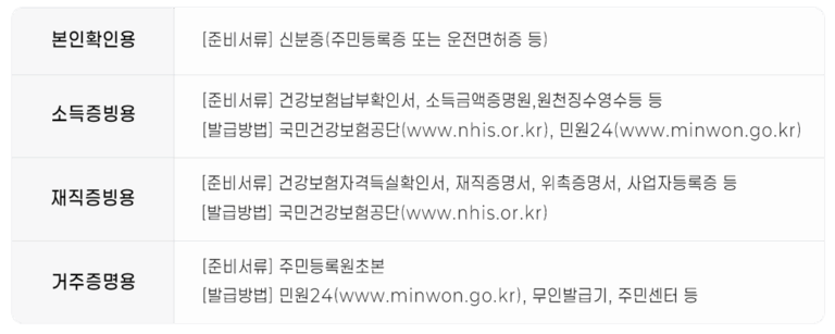 상세 서류는 상담 시 안내하여 드리며, 필요 시 기타 추가 서류 제출을 요청 받으실 수 있습니다.