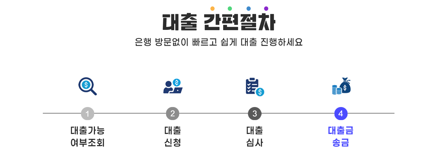 - 상품 관련 내용은 사전 통보 없이 변경 가능하며, 당행 여신 규정 및 관련 법규에 의거하여 금융기관의 신용 관리대상 거래처로 규제된 경우 또는 당행 심사기준과 고객신용도에 따라 대출이 거절될 수 있습니다.